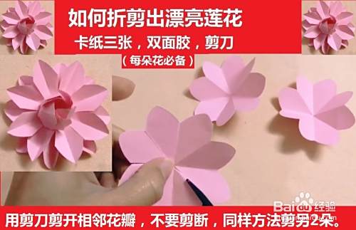 用三张粉红色的彩纸可通过折纸,剪纸,粘贴,合拢形成一朵漂亮的莲花。