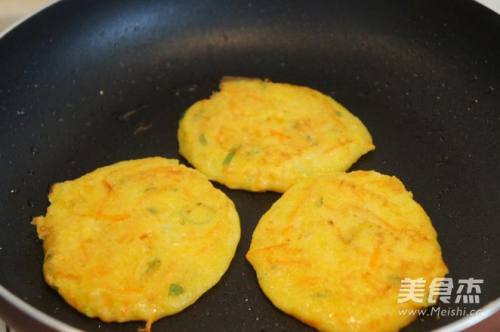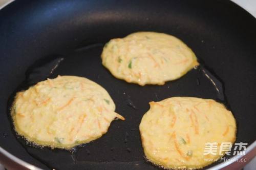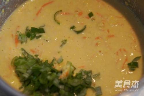 9不粘锅薄薄的刷上油,舀一勺嫩玉米糊倒入锅中