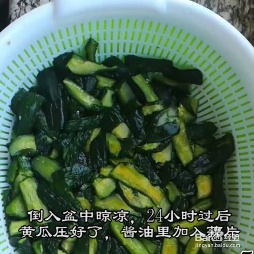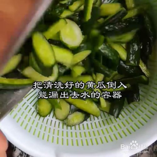 然后用清水清洗2次。冲掉一些盐分。把洗好的黄瓜倒入能漏水的容器。