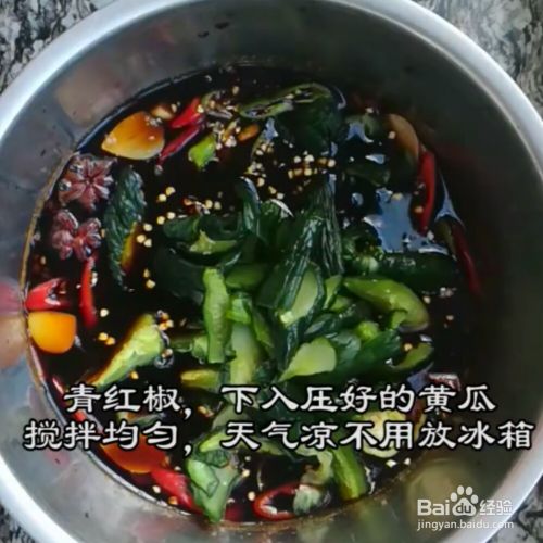 下入腌好的黄瓜,搅拌均匀。天气凉也不用放冰箱。泡五个小时就可以吃啦。