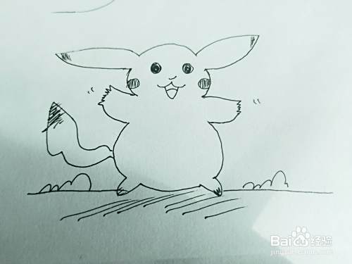 第四步,我们来画卡通皮卡丘的尾巴部分,还有双腿下方的土地线条,如下图