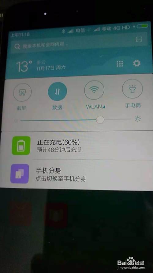 最后回到手机首页上,下拉一下看看,截图功能键是不是排序在第一位了。好了,是不是很简单,大家有需要的可以去试一下吧。
