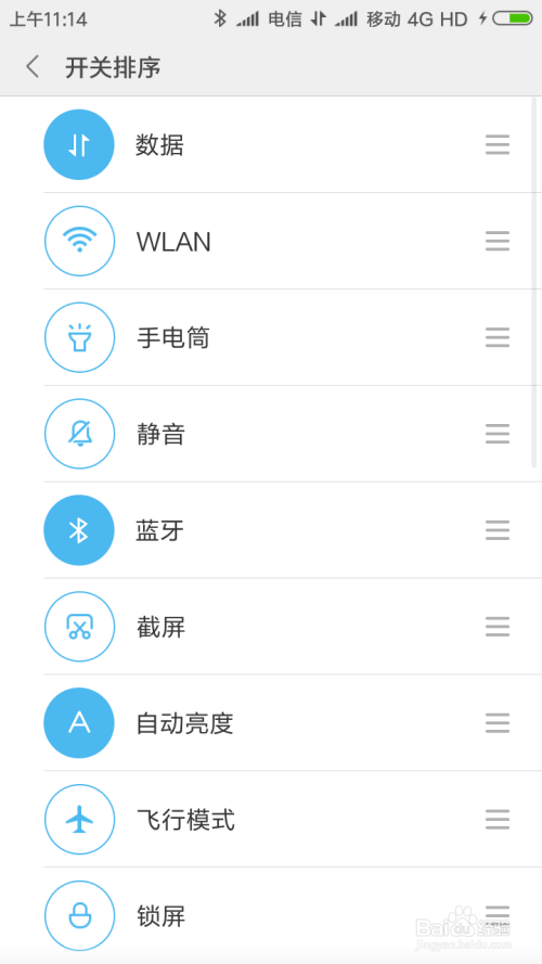 今天和大家分享的是手机状态栏的开关的排序,有些时候我们经常用的几个功能往往在很后面,比如截图功能键,那么如何把这些常用功能排序到最前面呢?下面就看我来操作。