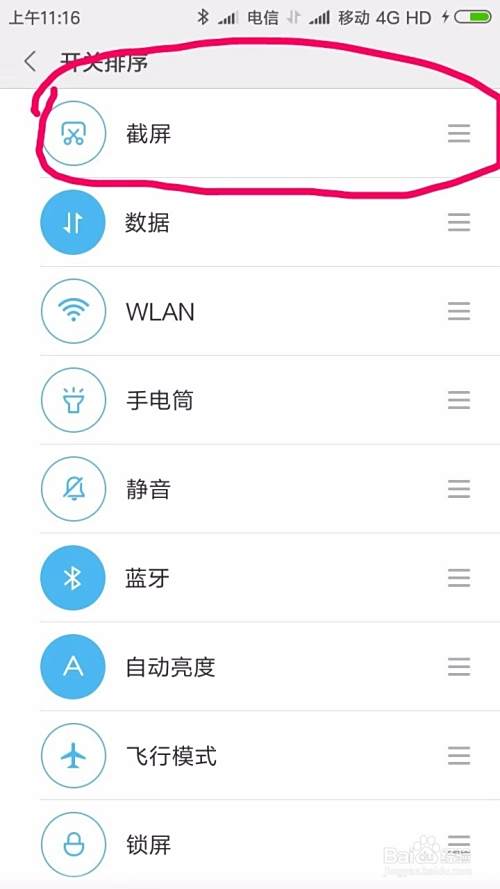 这里我们把常用的截图功能来提到手机第一排来作演示。我们按住功能键往上拖放。如上面所示;;