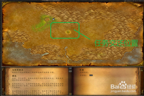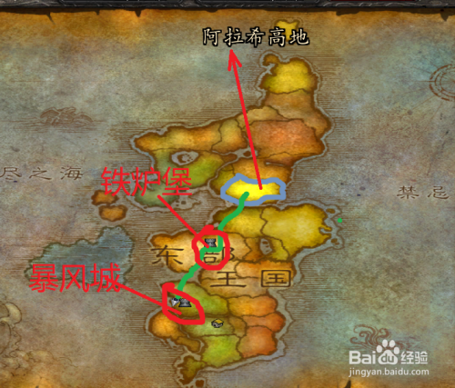 因为我们没有开启阿拉希高地的飞行点,所以只能先从暴风城到铁炉堡,再从铁炉堡通过湿地到达阿拉希高地,到达阿拉希高地时,查看地图,地图上的黄色门号就是任务的交还地点。