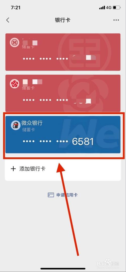 之后,我们在银行卡页面中,可以看到我们所有绑定在微信上的储蓄卡或者信用卡,我们要在这些银行卡中,找到微众银行。