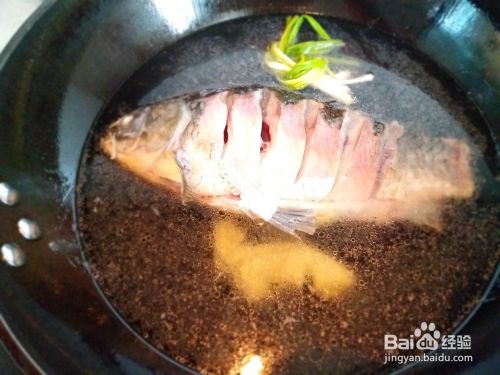 2热锅冷油,油不需要太多。油温上去后放入鲫鱼煎至两面金黄,加入适量水,放入姜片,葱结以及几滴料酒。大火将水烧开后转小火慢慢熬。