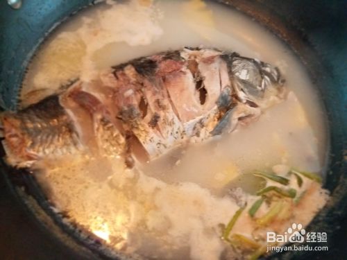 4鱼汤熬至呈乳白色即可(大约需要二十几分钟),往汤中加入适量盐。