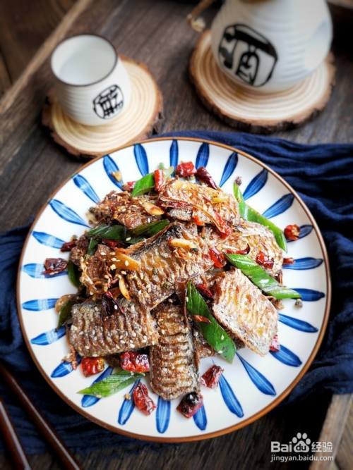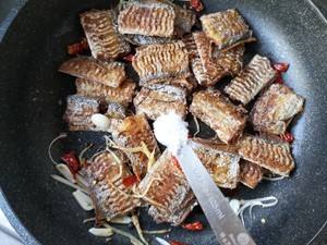 煎好的鱼沥油捞出,另起锅加适量油烧热,下入姜蒜,花椒干辣椒爆香
