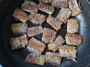 2、锅中适量油(比平时炒菜的油要多一些),烧至5-6成热,下入腌制好的带鱼,中小火煎,刚下锅时候不要急于翻动,待一面煎到金黄稍微变硬后再翻动,不然鱼肉容易破。