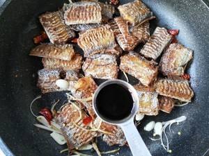 下入煎好的带鱼,淋入1勺特级原汁酱油翻炒均匀。