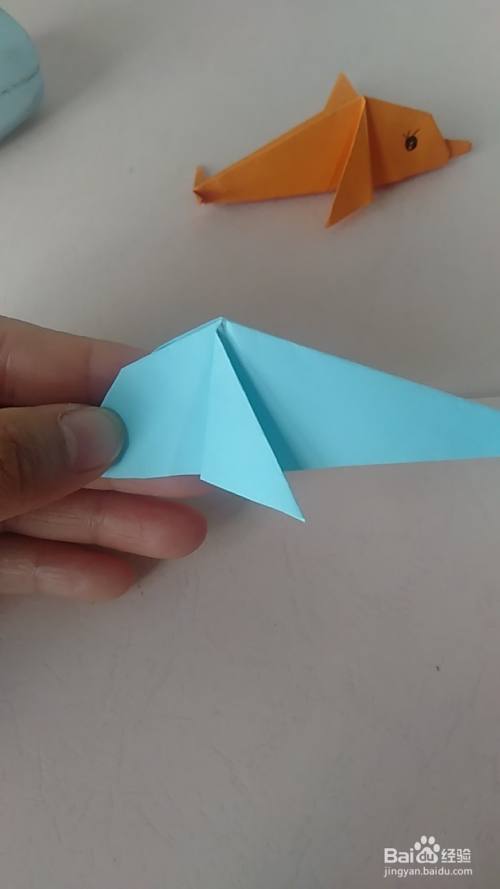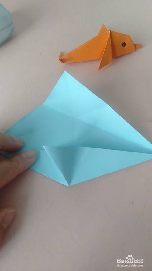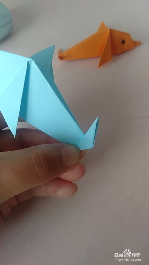 在按照下图折叠出尾巴,用彩笔画上可爱的眼睛即可。又可爱又简单的小海豚就折叠好了。