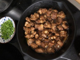 热油,先加入蒜片和葱根,爆香,然后放入排骨(腌半个小时会更入味,当场煎也不错)