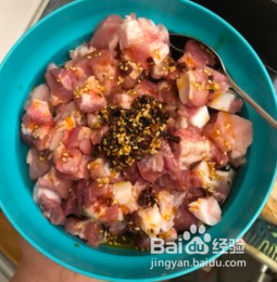 排骨,切小(尽量小,才入味,煎出来的脆骨才吃得动?)加入油辣子,生抽,老抽(少许),砂糖,料酒,拌匀。