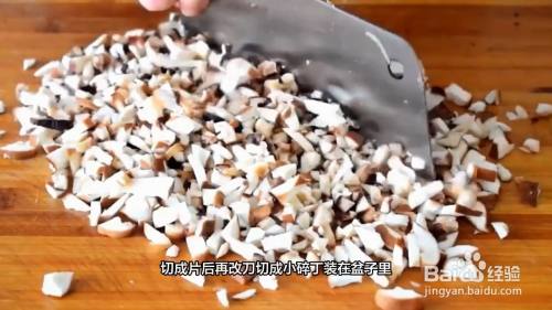 洗净的香菇根部去掉,切成片后再改刀切成小碎丁装在盆子里,猪肉切成片后剁成肉末备用。