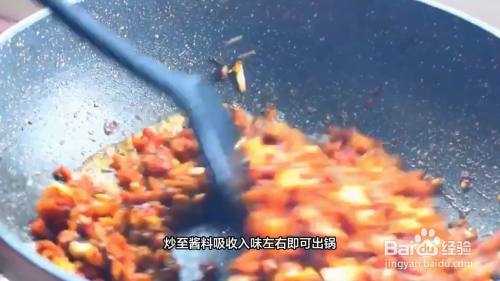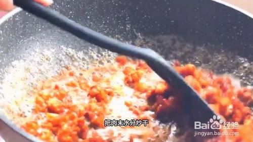 起锅烧油,油热后加入白糖炒至融化,加入肉末翻炒,把肉末水分炒干,炒出油后,放入辣椒酱和姜蒜末,继续翻炒。