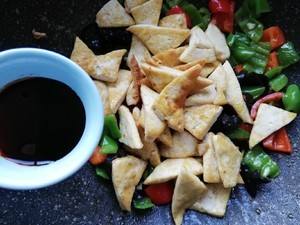先把豆腐在温盐水里浸泡一会后沥干,将豆腐切成正方形,再斜刀切成三角形放入盘中,提前泡发的木耳、青红辣椒切成小块备用