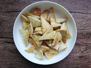 锅中加入适量食用油,烧至6成热,将豆腐沿着锅边一片一片的放入锅内,让豆腐自然滑到锅中,不要直接把豆腐倒入锅中,这样可能会溅到油而且会弄碎豆腐,煎的时候尽量油温高一些,火小一点,慢慢煎,因为火大了,就很容易糊,不要急着翻动,否则很容易破,要等底面煎黄、定型了再翻面