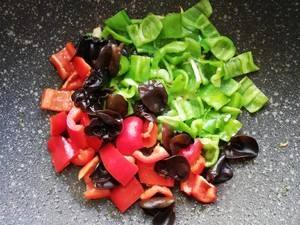 锅留少许底油,烧至5成热,下入姜末煸香,再倒入青红椒、木耳煸炒断生