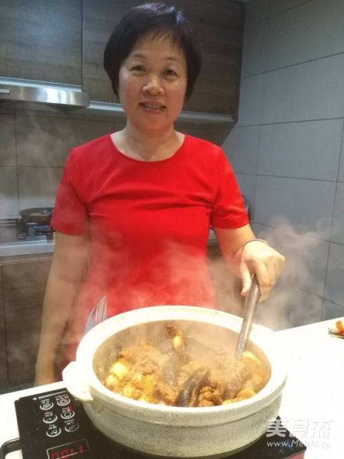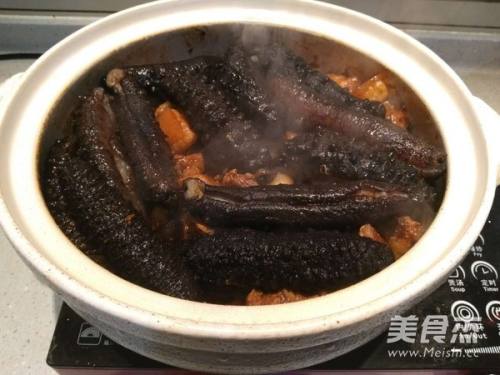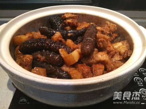 7放入海参,海参是熟的,不用过分加热,搅拌后关火使其入味即可,利用土锅特有的余温加热功能,将肉香进入海参中,鲜而不腻,保证胃口大开,减肥的你也要多吃几口。