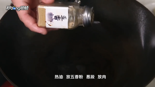 热油,放五香粉、葱段,放肉,倒酱油翻炒至边缘变微黄色。