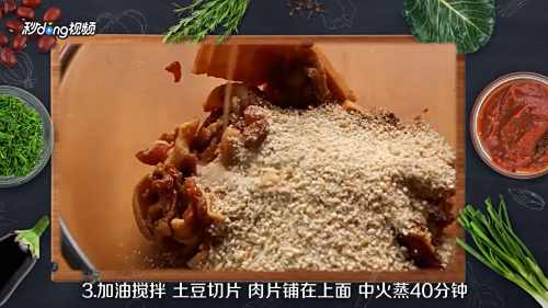 加油搅拌,土豆切片,肉铺在上面,中火蒸40分钟。