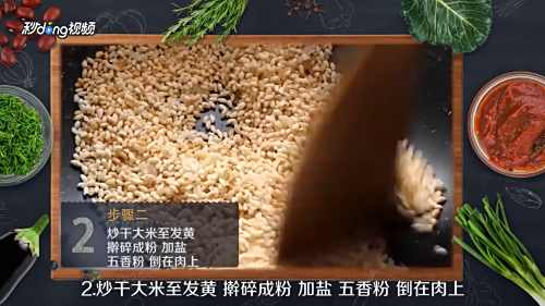 大米炒黄,碾碎,混合盐,五香粉倒在肉上。