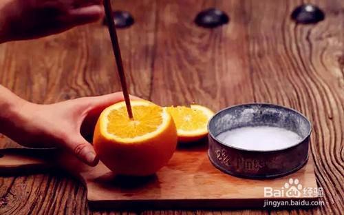 然后盖上刚才切下来的那一块的橙子皮,用两根牙签固定住,变成一个像是没有切开的橙子。
