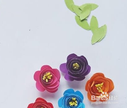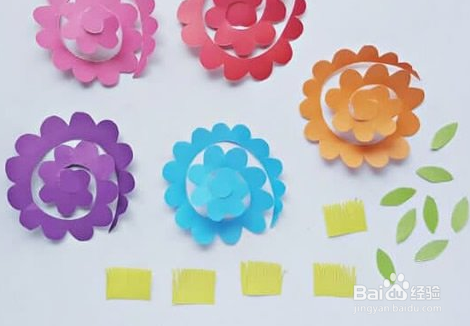 从彩色卡纸上剪出如图的花、花蕊和叶子。