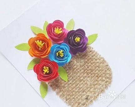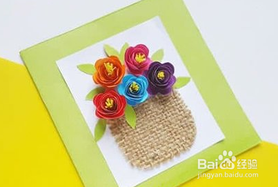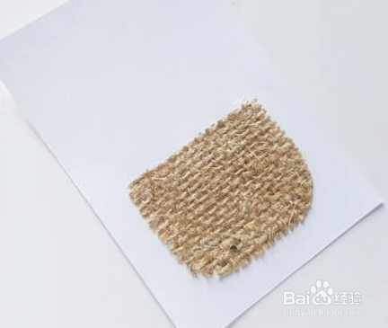 把麻布剪成花瓶形状,粘贴到白色卡纸上。