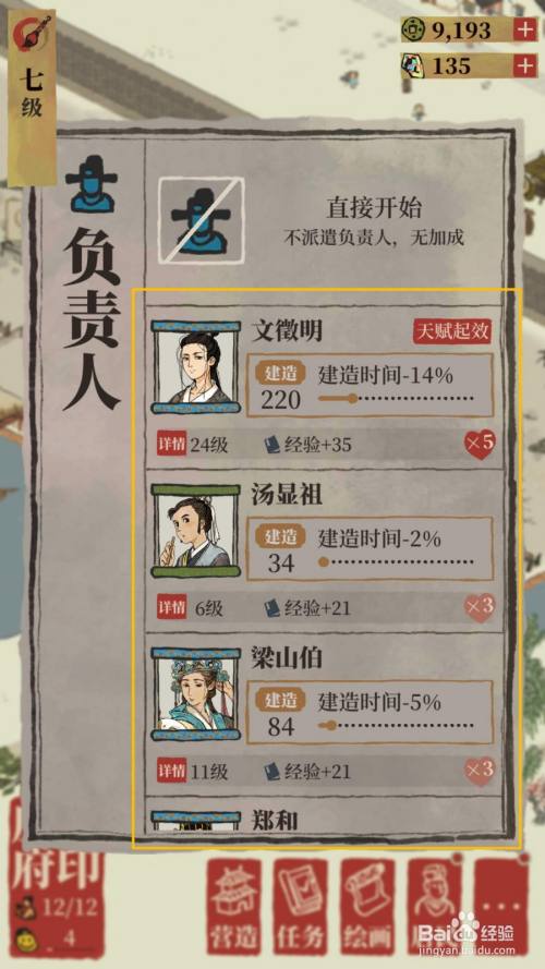 在“负责人”界面中,选择可以减少建造时间的居民作为负责人。