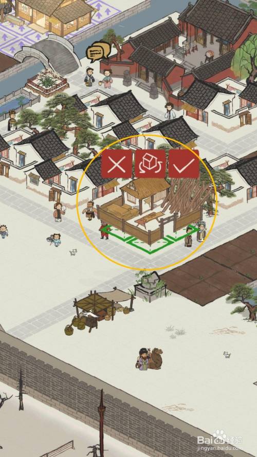 在“江南百景图”布局中,移动“锯木厂”建筑物到合适的区域,点击上方的“√”按钮。
