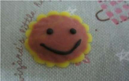 4把准备好的黄色花叶均匀粘于棕色花芯周边上 ,黑色眼睛、嘴巴粘在棕色花芯上成笑脸谱。