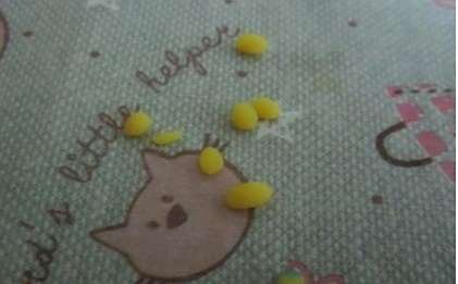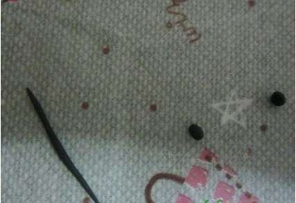 3然后用黑色橡皮泥捏两个小黑点作为眼睛,一个小黑条作为嘴巴。