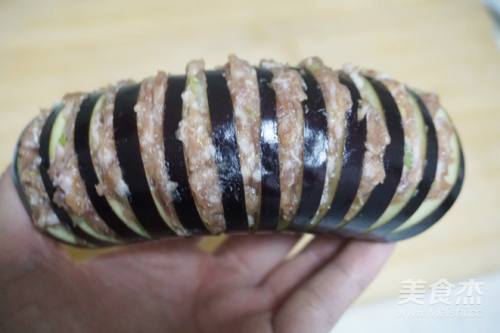 4肉馅里加入料酒、生抽、盐和少许香油,搅拌均匀。在切好的每片茄子中塞满肉馅,依次都做好。