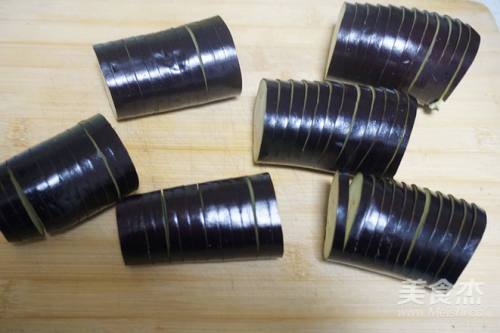 2还记得我们做蓑衣黄瓜么?为了切得时候不切断,将两根筷子放在茄子两边,切均匀的厚度就可以了。