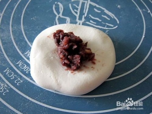 揪一小块,用手搓圆,再压成小饼形,包上豆沙,搓圆,压成小饼