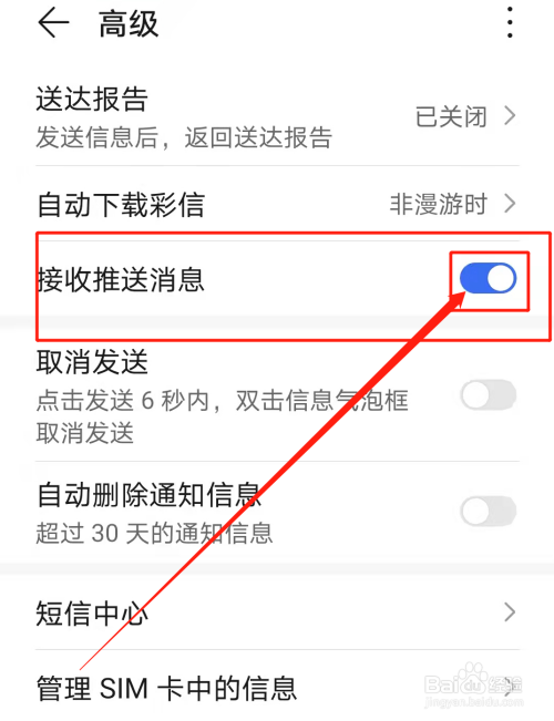进入短信高级设置界面后,关闭接收推送消息后面的开关即可。