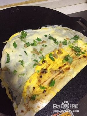 将煎饼提起反过来,并涂抹甜面酱,葱花,杂菜和香菜碎,