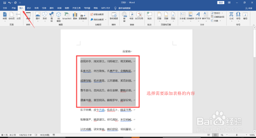 操作二:选择需要添加表格的文字,点击【插入】选项卡,操作如下。