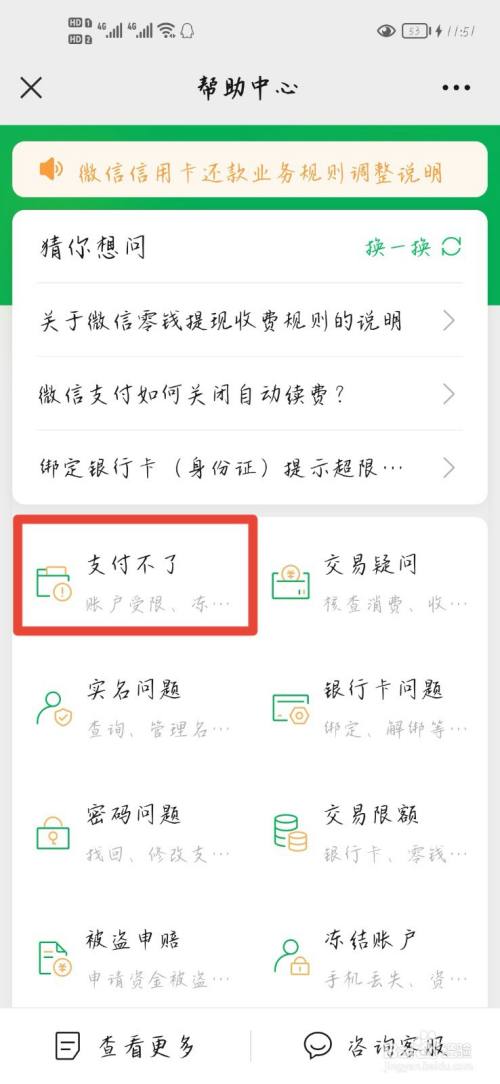在帮助中心界面,找到支付不了功能选项,点击进入。