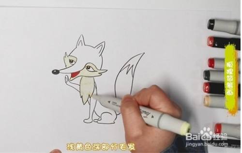 然后就可以开始涂色啦,我们先给狐狸的鼻尖涂黑色,面部和脖子上的毛发涂浅黄色。