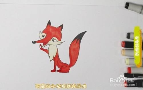 给它身体上的毛发涂上红色,耳朵和尾巴尖部涂黑色,可爱的狐狸简笔画就完成啦!