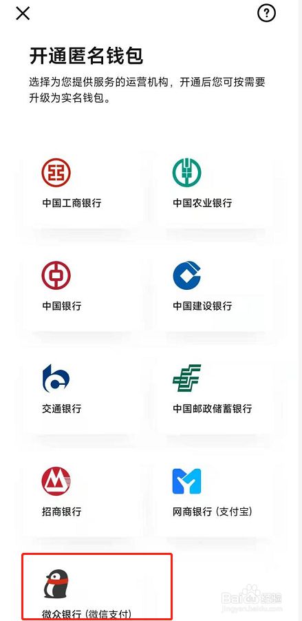 然后在我的-开通或添加数字人民币页面中选择微众银行,也就是微信支付。