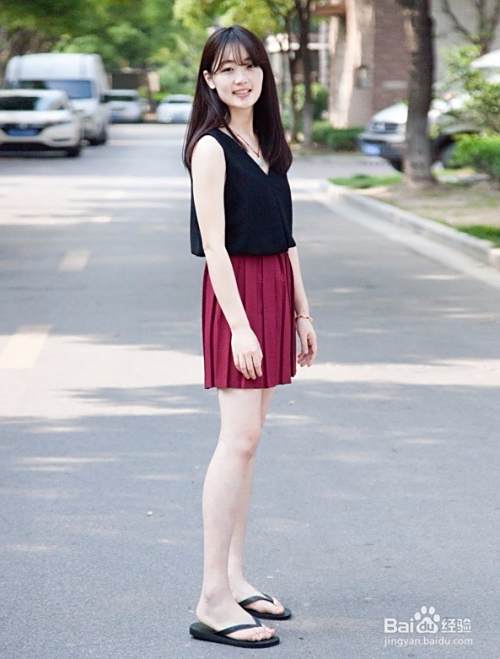 黑色无袖雪纺衫是一款很低调、大方又显瘦的衣服,搭配一条酒红色百褶短裙,显瘦又洋气。