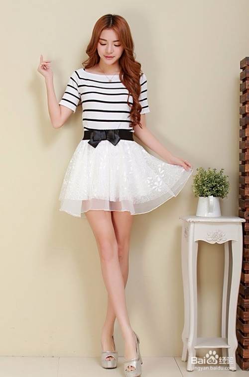 条纹T恤是我们平时经常穿的,这款白色条纹T恤是比较修身的,搭配一条白色网纱百褶短裙,大方又显气质。