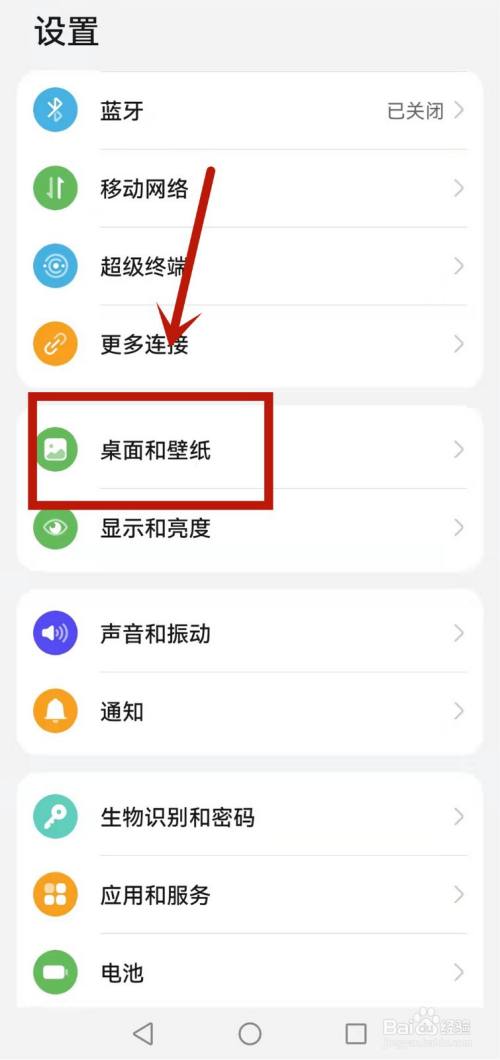 进入手机设置中,选择一下页面的桌面和壁纸选项。