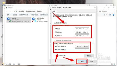 3. 分别输入IP地址、子网掩码、默认网关、首选DNS服务器——“确定”