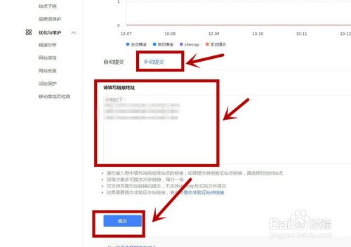 2、这里也是有两种提交的方法的,一种是自动提交(较为复杂,要有一定网页代码知识)另一种是手动提交,我们不懂就用这种,手动输入地址提交就可以。提交成功后百度就会加快收录。