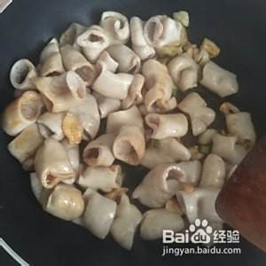 倒入大肠加料酒、生抽、蚝油、盐、鸡精翻炒上色均匀。